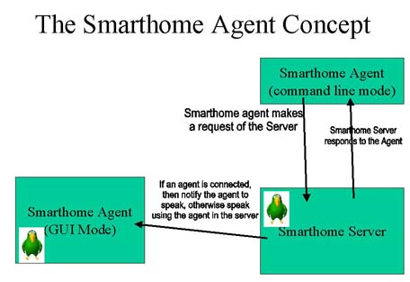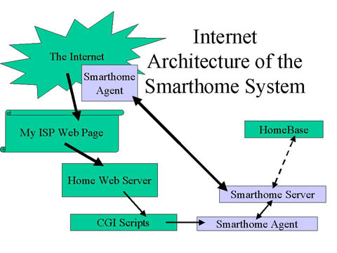 I run DynamIP which senses when my Toshiba machine connects to the Internet and uploads an HTML file with its dynamically assigned IP address to my home page. From any browser anywhere on the Internet I can follow this link to connect with Apache running on the home Toshiba machine. A set of HTML files on this machine provide a user interface for the system. CGI scripts called by the HTML pages make calls to the command line interface of the Smarthome Agent to do the actual work of turning things on and off, or retrieving information from the Smarthome Server. I can also run the Smarthome Agent remotely on the Internet and type commands and receive responses directly from the Smarthome Server.
